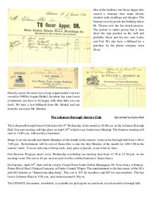 The Lebanon Borough Senior Club meets the 4 th Wednesday of the month at 10:00 a.m. in the Lebanon Borough