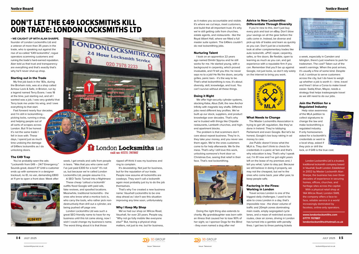» WE CAUGHT UP WITH ALAN SHARPE, founder of London Locksmiths Ltd and a veteran of more than 35 years in the trade, who is speaking out against the rise of so-called“£ 49 locksmiths”, rogue operators scamming customers and ruining the trade’ s hard-earned reputation. Alan told us that trust and transparency are everything and that’ s exactly that’ s why he’ ll never shut-up shop.