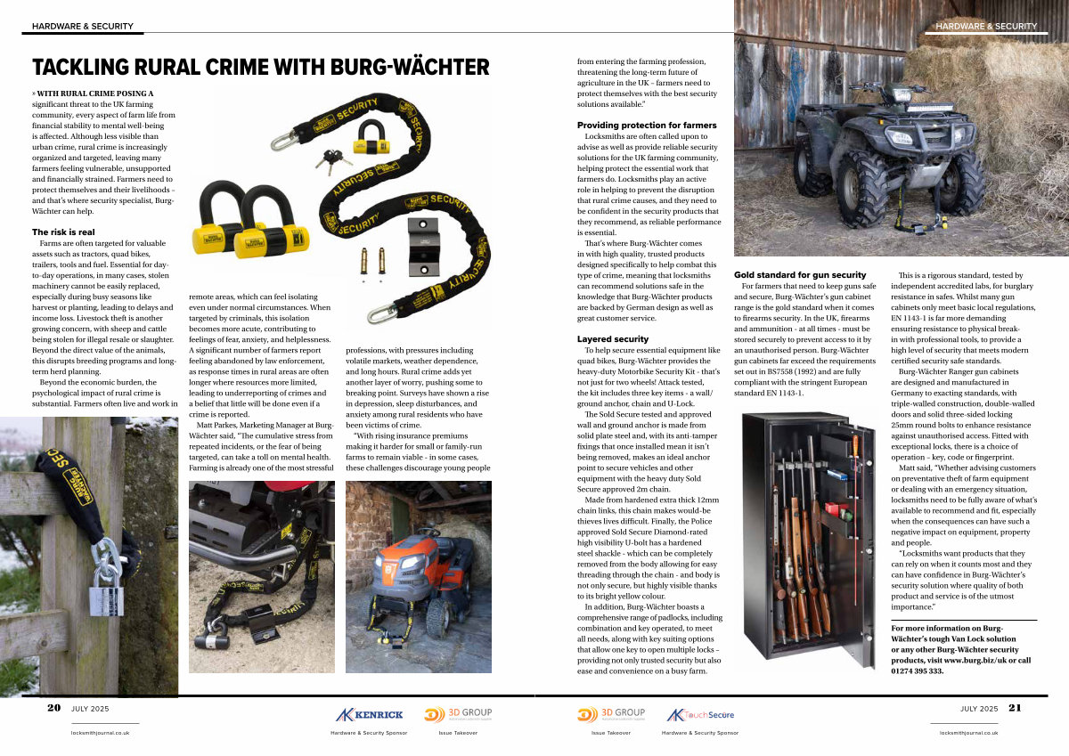 » WITH RURAL CRIME POSING A significant threat to the UK farming community, every aspect of farm life from financial stability to mental well-being is affected. Although less visible than urban crime, rural crime is increasingly organized and targeted, leaving many farmers feeling vulnerable, unsupported and financially strained. Farmers need to protect themselves and their livelihoods – and that’ s where security specialist, Burg- Wächter can help.