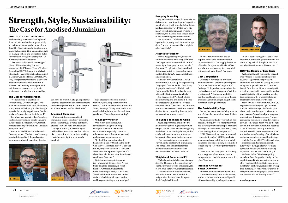 And that’ s where HOPPE adds real value – information and education to make sure you get the right product for every specification and application. Working together to make it work better for you. Ged concludes:“ We do everything ourselves, from the product design to the anodising, and that gives us the control to offer real, tangible benefits to customers. Whether it’ s aesthetics, sustainability, or longterm durability, we want people to choose the best product for their project. That’ s where conversations like this really matter.”