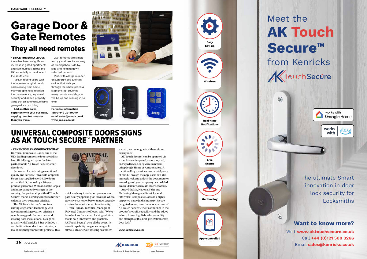 » KENRICKS HAS ANNOUNCED THAT Universal Composite Doors, one of the UK’ s leading composite door specialists, has officially signed up as the latest partner for its AK Touch Secure™ smart door lock.