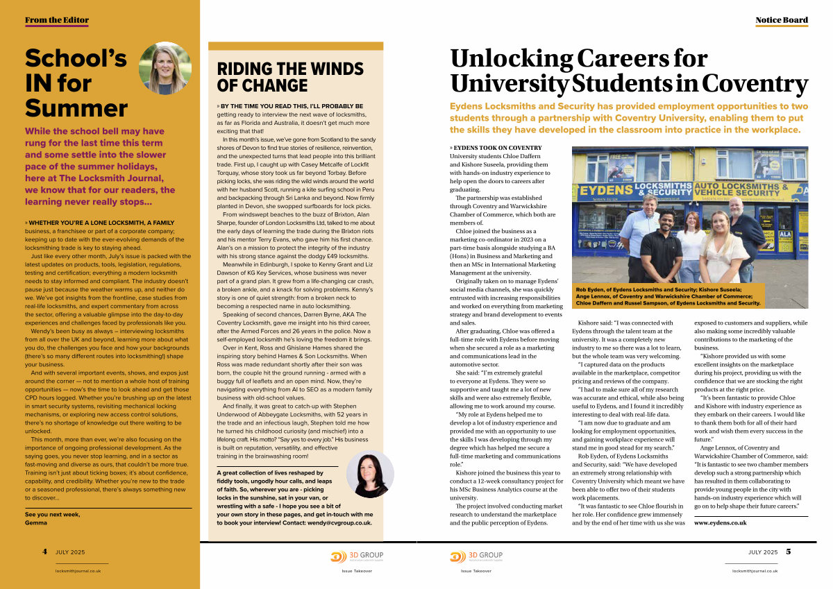 Just like every other month, July’ s issue is packed with the latest updates on products, tools, legislation, regulations, testing and certification; everything a modern locksmith needs to stay informed and compliant. The industry doesn’ t pause just because the weather warms up, and neither do we. We’ ve got insights from the frontline, case studies from real-life locksmiths, and expert commentary from across the sector, offering a valuable glimpse into the day-to-day experiences and challenges faced by professionals like you.