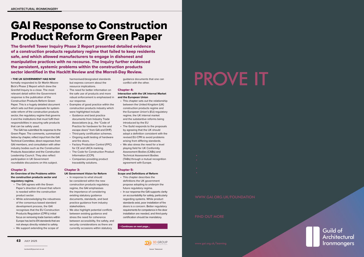 » THE UK GOVERNMENT HAS NOW formally responded to Sir Martin Moore- Bick’ s Phase 2 Report which drew the Grenfell Inquiry to a close. The most relevant detail within the Government response is the publication of the Construction Products Reform Green Paper. This is a hugely detailed document which sets out their proposals for systemwide reform of the construction products sector, the regulatory regime that governs it and the institutions that must fulfil their responsibilities in assuring safe products that can be safely used.