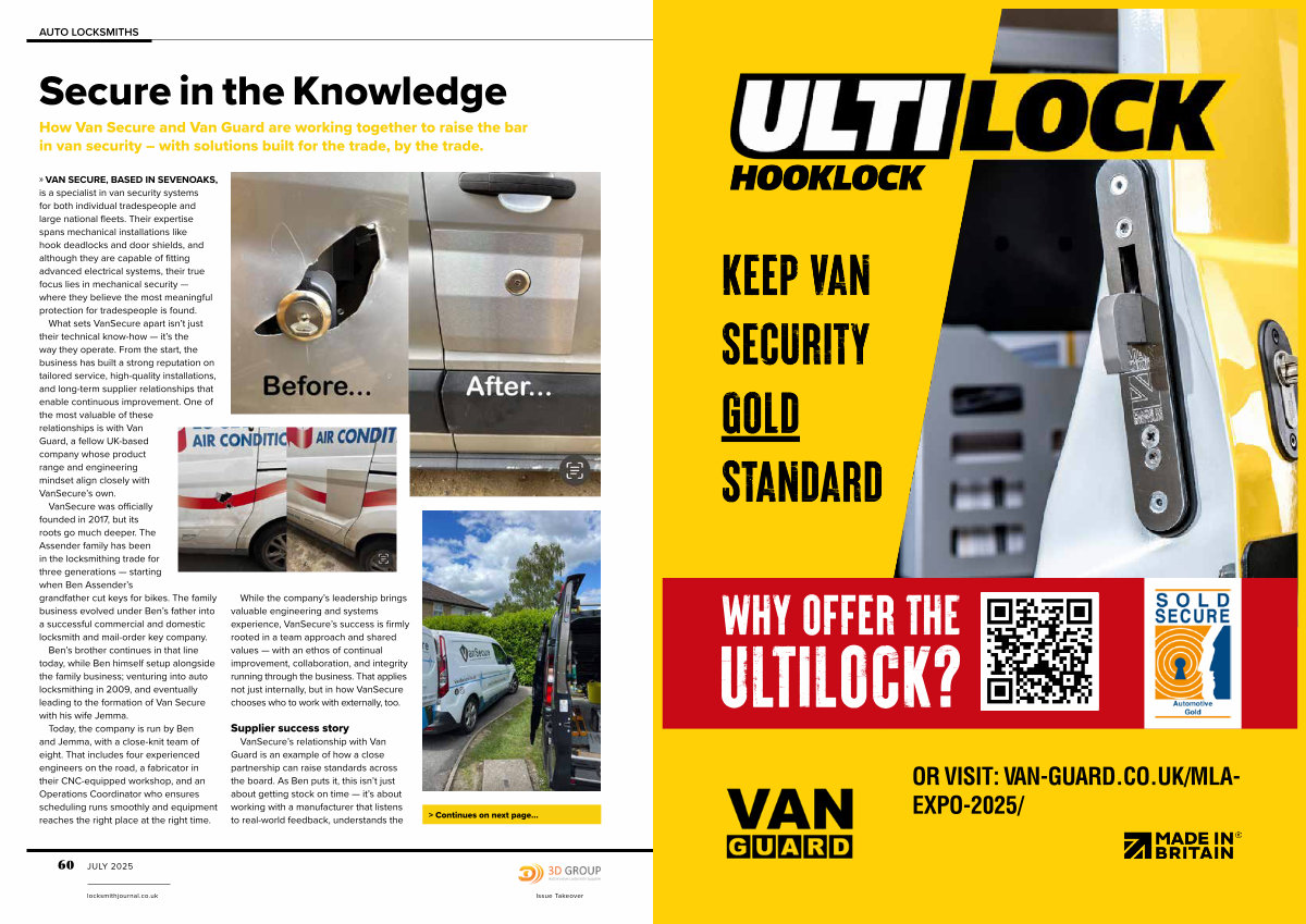 » VAN SECURE, BASED IN SEVENOAKS, is a specialist in van security systems for both individual tradespeople and large national fleets. Their expertise spans mechanical installations like hook deadlocks and door shields, and although they are capable of fitting advanced electrical systems, their true focus lies in mechanical security— where they believe the most meaningful protection for tradespeople is found.