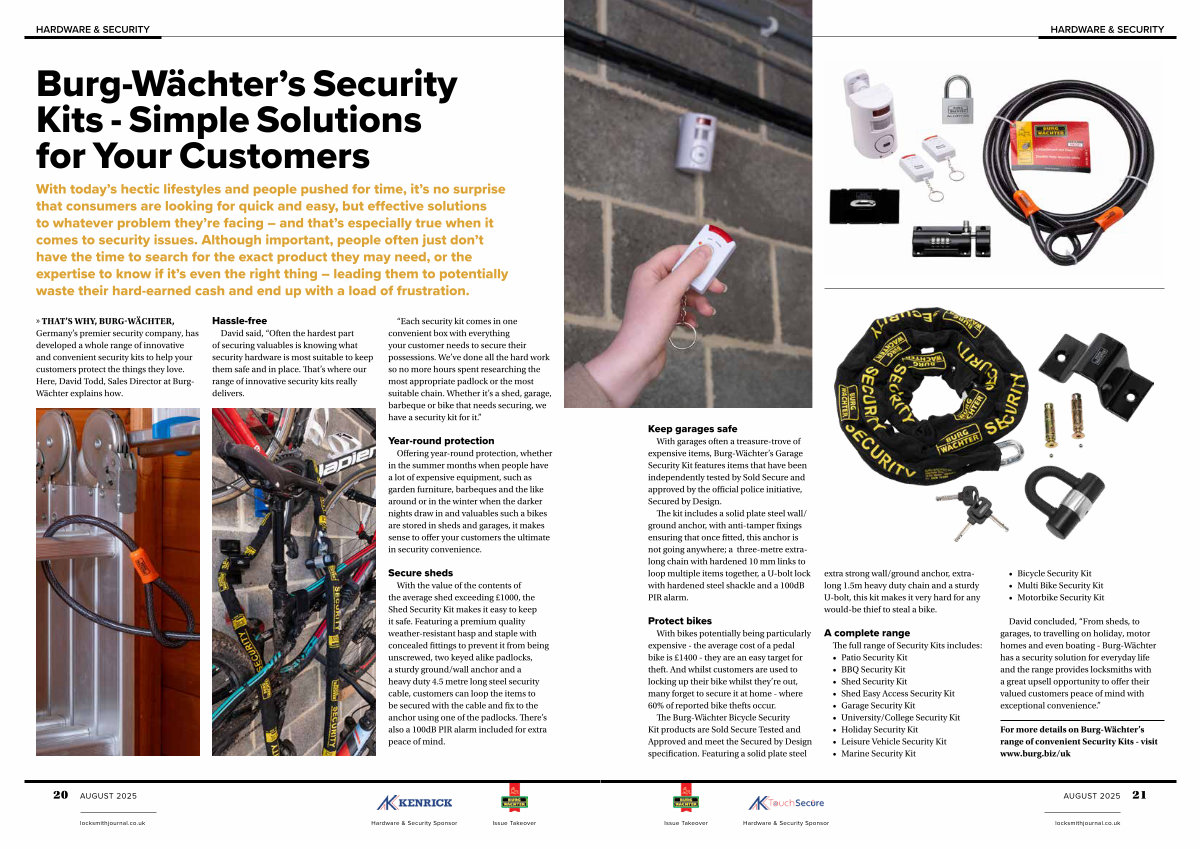 » THAT’ S WHY, BURG-WÄCHTER, Germany’ s premier security company, has developed a whole range of innovative and convenient security kits to help your customers protect the things they love. Here, David Todd, Sales Director at Burg- Wächter explains how.