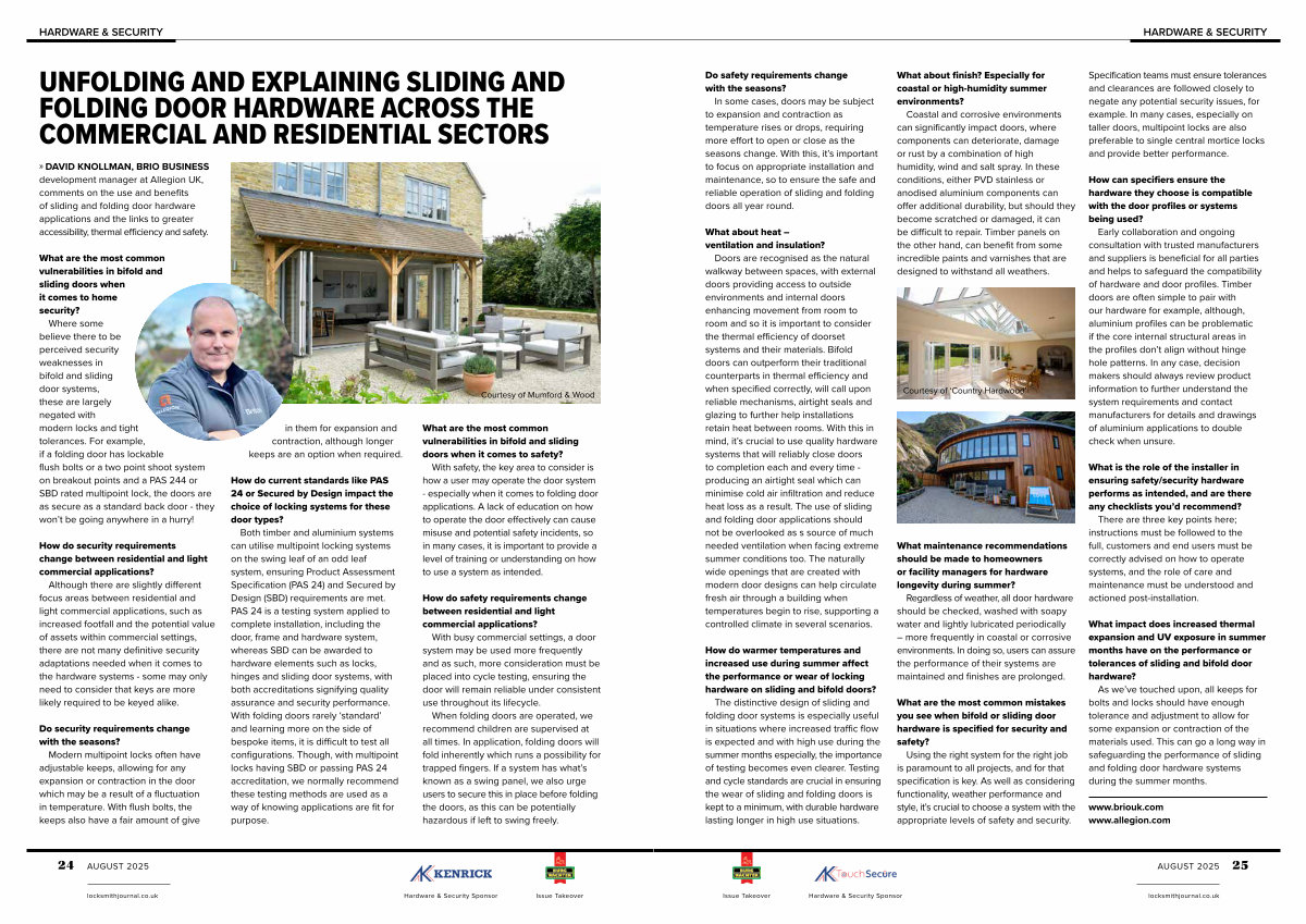» DAVID KNOLLMAN, BRIO BUSINESS development manager at Allegion UK, comments on the use and benefits of sliding and folding door hardware applications and the links to greater accessibility, thermal efficiency and safety.