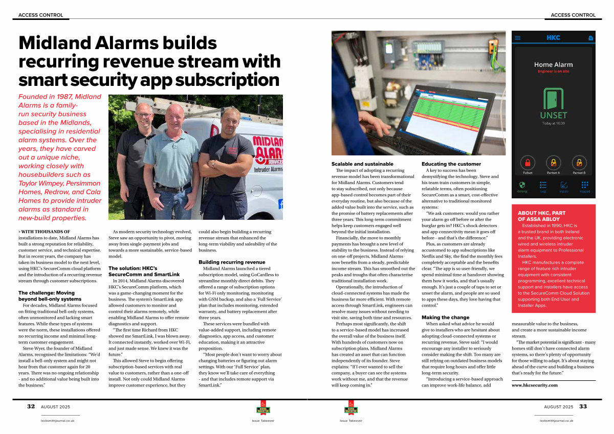 » WITH THOUSANDS OF installations to date, Midland Alarms has built a strong reputation for reliability, customer service, and technical expertise. But in recent years, the company has taken its business model to the next level, using HKC’ s SecureComm cloud platform and the introduction of a recurring revenue stream through customer subscriptions.
