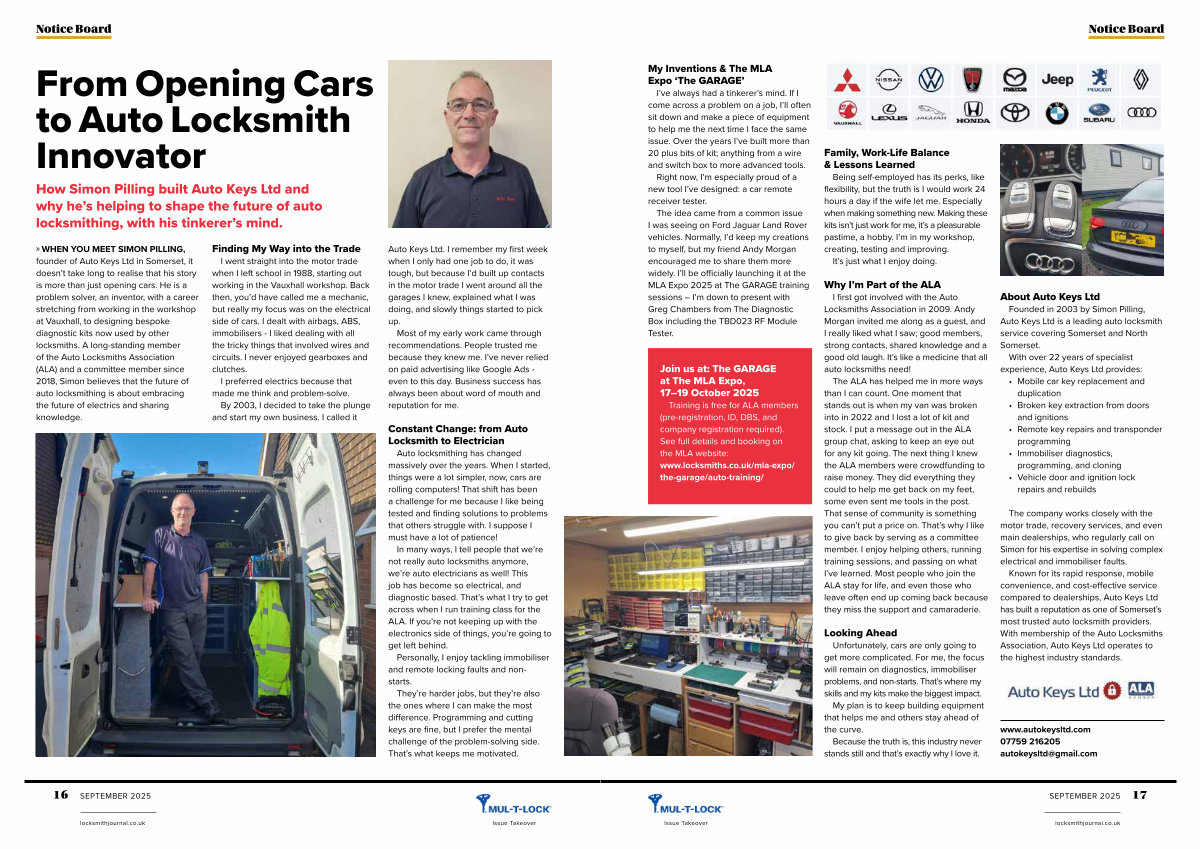 » WHEN YOU MEET SIMON PILLING, founder of Auto Keys Ltd in Somerset, it doesn’ t take long to realise that his story is more than just opening cars. He is a problem solver, an inventor, with a career stretching from working in the workshop at Vauxhall, to designing bespoke diagnostic kits now used by other locksmiths. A long-standing member of the Auto Locksmiths Association( ALA) and a committee member since 2018, Simon believes that the future of auto locksmithing is about embracing the future of electrics and sharing knowledge.