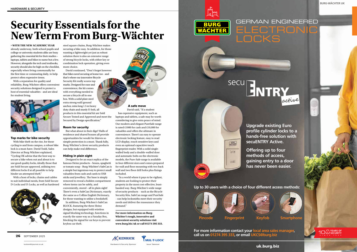 “ In a world where it pays to be vigilant, students are looking to protect their property in the most cost-effective, leasthassled way. Burg-Wächter’ s wide range of security products- such as the Bicycle Security Kits, SafeCan range and PureSafe- can help locksmiths meet their security needs and deliver the reassurance they demand.”