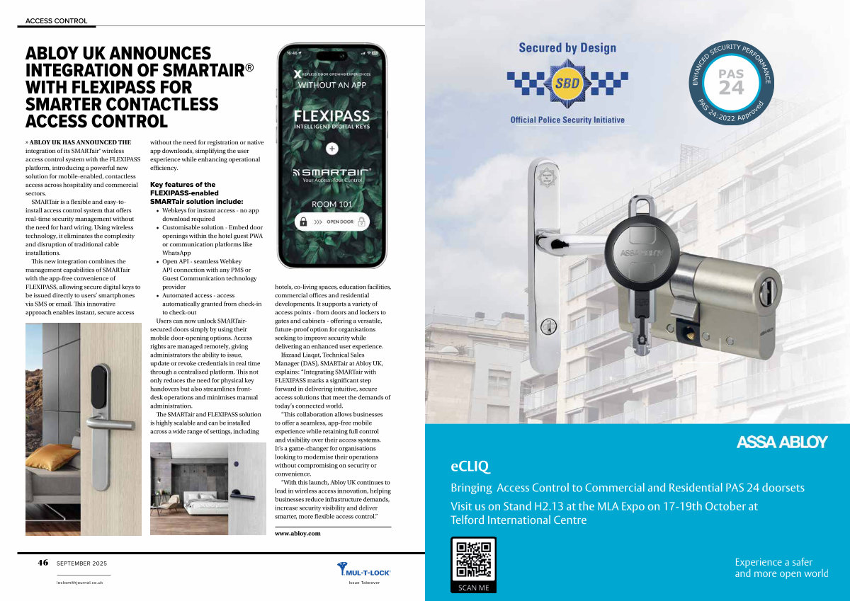 Ifazaad Liaqat, Technical Sales Manager( DAS), SMARTair at Abloy UK, explains:“ Integrating SMARTair with FLEXIPASS marks a significant step forward in delivering intuitive, secure access solutions that meet the demands of today’ s connected world.