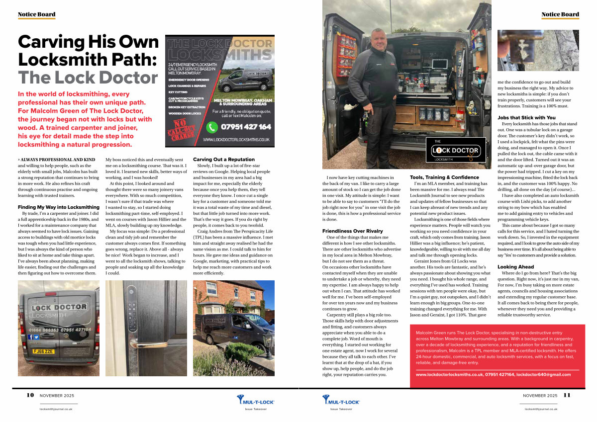 Malcolm Green runs The Lock Doctor, specialising in non-destructive entry across Melton Mowbray and surrounding areas. With a background in carpentry, over a decade of locksmithing experience, and a reputation for friendliness and professionalism, Malcolm is a TPL member and MLA-certified locksmith. He offers 24-hour domestic, commercial, and auto locksmith services, with a focus on fast, reliable, and damage-free entry.