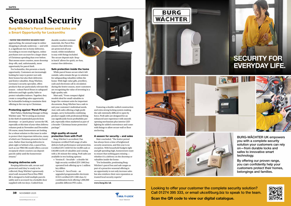 “ For locksmiths, positioning Burg- Wächter’ s parcel box and safe ranges as part of a proactive seasonal offering is an opportunity to not only increase sales but also reinforce their own reputation as trusted local security experts.”