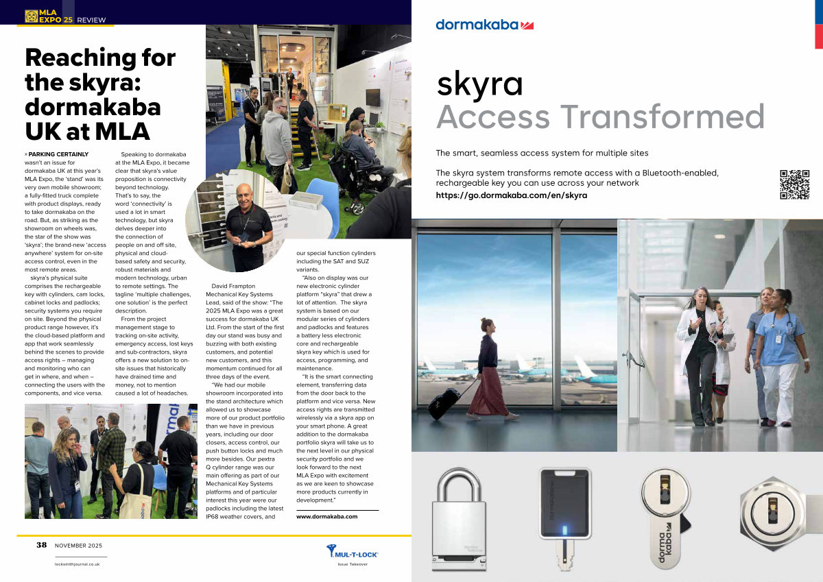 » PARKING CERTAINLY wasn’ t an issue for dormakaba UK at this year’ s MLA Expo, the‘ stand’ was its very own mobile showroom; a fully-fitted truck complete with product displays, ready to take dormakaba on the road. But, as striking as the showroom on wheels was, the star of the show was‘ skyra’; the brand-new‘ access anywhere’ system for on-site access control, even in the most remote areas. skyra’ s physical suite comprises the rechargeable key with cylinders, cam locks, cabinet locks and padlocks; security systems you require on site. Beyond the physical product range however, it’ s the cloud-based platform and app that work seamlessly behind the scenes to provide access rights – managing and monitoring who can get in where, and when – connecting the users with the components, and vice versa.
