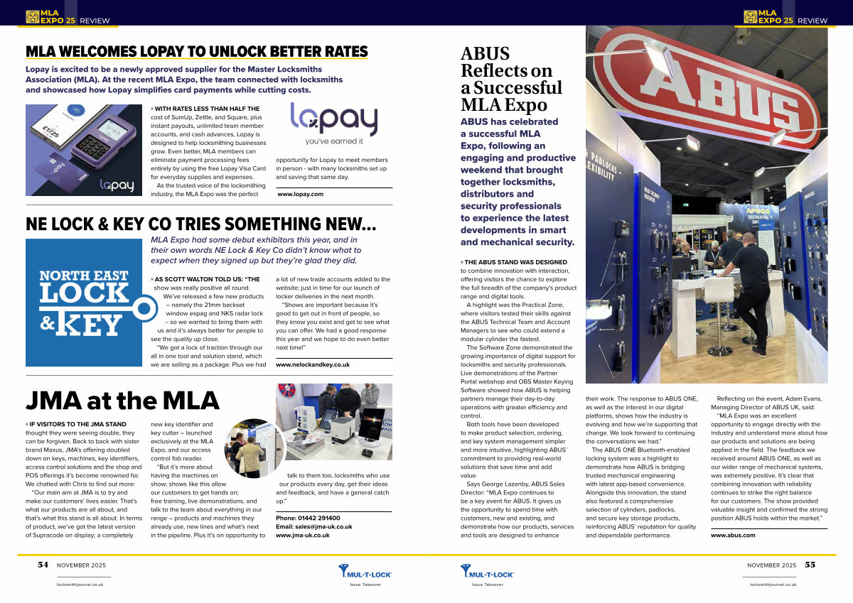 » IF VISITORS TO THE JMA STAND thought they were seeing double, they can be forgiven. Back to back with sister brand Maxus, JMA’ s offering doubled down on keys, machines, key identifiers, access control solutions and the shop and POS offerings it’ s become renowned for. We chatted with Chris to find out more:“ Our main aim at JMA is to try and make our customers’ lives easier. That’ s what our products are all about, and that’ s what this stand is all about. In terms of product, we’ ve got the latest version of Supracode on display; a completely new key identifier and key cutter – launched exclusively at the MLA Expo, and our access control fob reader.