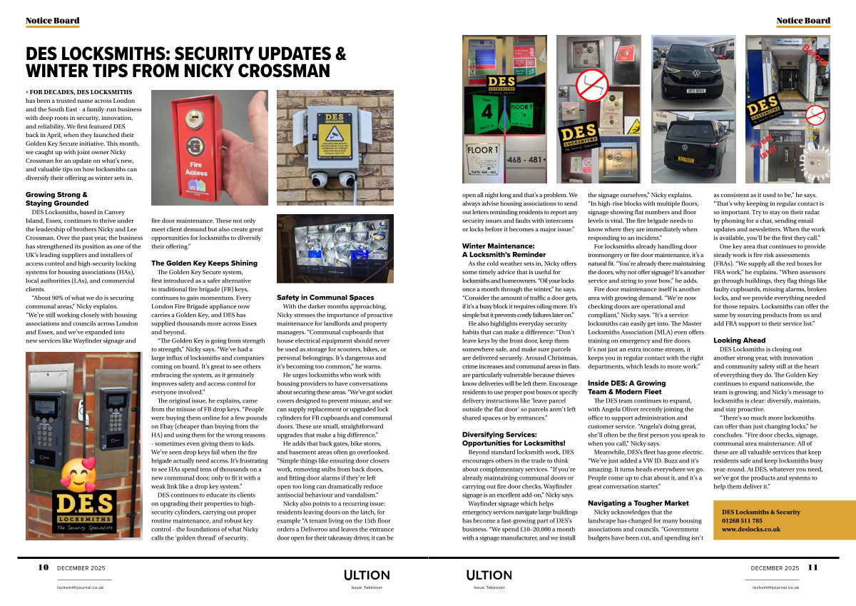 Looking Ahead DES Locksmiths is closing out another strong year, with innovation and community safety still at the heart of everything they do. The Golden Key continues to expand nationwide, the team is growing, and Nicky’ s message to locksmiths is clear: diversify, maintain, and stay proactive.