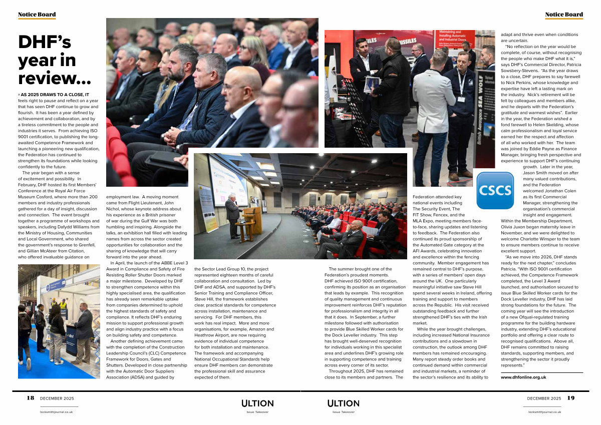 “ As we move into 2026, DHF stands ready for the next chapter,” concludes Patricia.“ With ISO 9001 certification achieved, the Competence Framework completed, the Level 3 Award launched, and authorisation secured to issue Blue Skilled Worker cards for the Dock Leveller industry, DHF has laid strong foundations for the future. The coming year will see the introduction of a new Ofqual-regulated training programme for the building hardware industry, extending DHF’ s educational portfolio and offering a clear route to recognised qualifications. Above all, DHF remains committed to raising standards, supporting members, and strengthening the sector it proudly represents.”