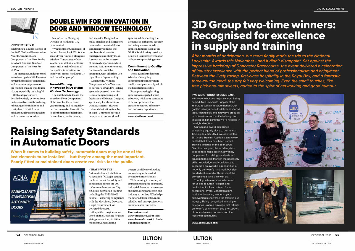» WINKHAUS UK IS celebrating a double success at the 2025 National Fenestration Awards, winning Door Component of the Year for the autoLock AV4 and Window Component of the Year for aluPilot.