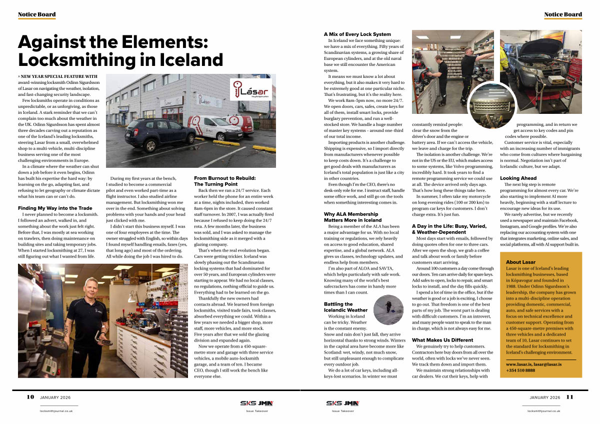 About Lasar Lasar is one of Iceland’ s leading locksmithing businesses, based in Kópavogur and founded in 1988. Under Odinn Sigurdsson’ s leadership, the company has grown into a multi-discipline operation providing domestic, commercial, auto, and safe services with a focus on technical excellence and customer support. Operating from a 450-square-metre premises with three vehicles and a dedicated team of 10, Lasar continues to set the standard for locksmithing in Iceland’ s challenging environment.
