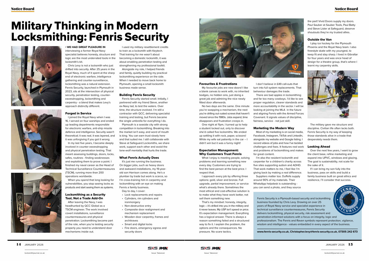 Chris Levy is not a locksmith who just drifted into security. After 25 years in the Royal Navy, much of it spent at the sharp end of electronic warfare, intelligence gathering and counter-surveillance, locksmithing was a natural extension. Fenris Security, launched in Plymouth in 2023, sits at the intersection of physical security, penetration testing, countereavesdropping, locksmithing and carpentry- a blend that makes Levy’ s approach distinctly different.