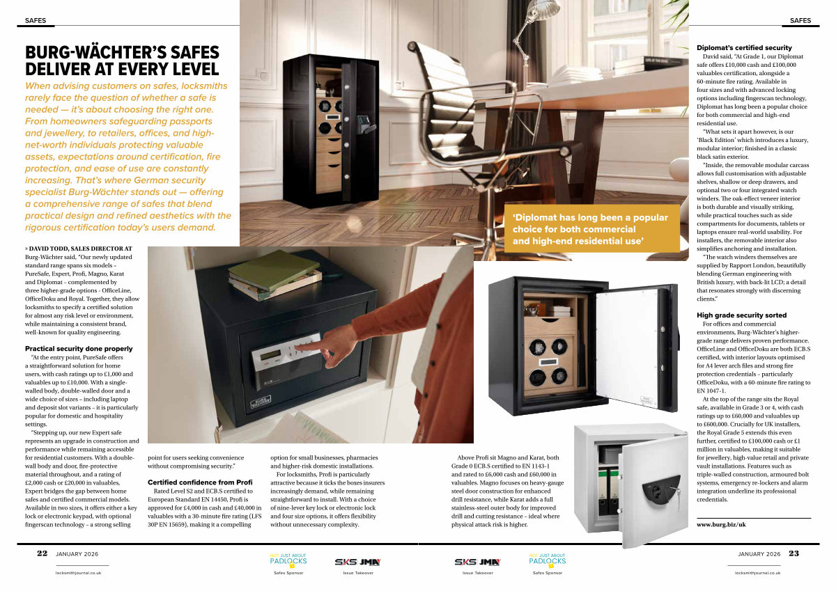 » DAVID TODD, SALES DIRECTOR AT Burg-Wächter said,“ Our newly updated standard range spans six models – PureSafe, Expert, Profi, Magno, Karat and Diplomat – complemented by three higher-grade options- OfficeLine, OfficeDoku and Royal. Together, they allow locksmiths to specify a certified solution for almost any risk level or environment, while maintaining a consistent brand, well-known for quality engineering.