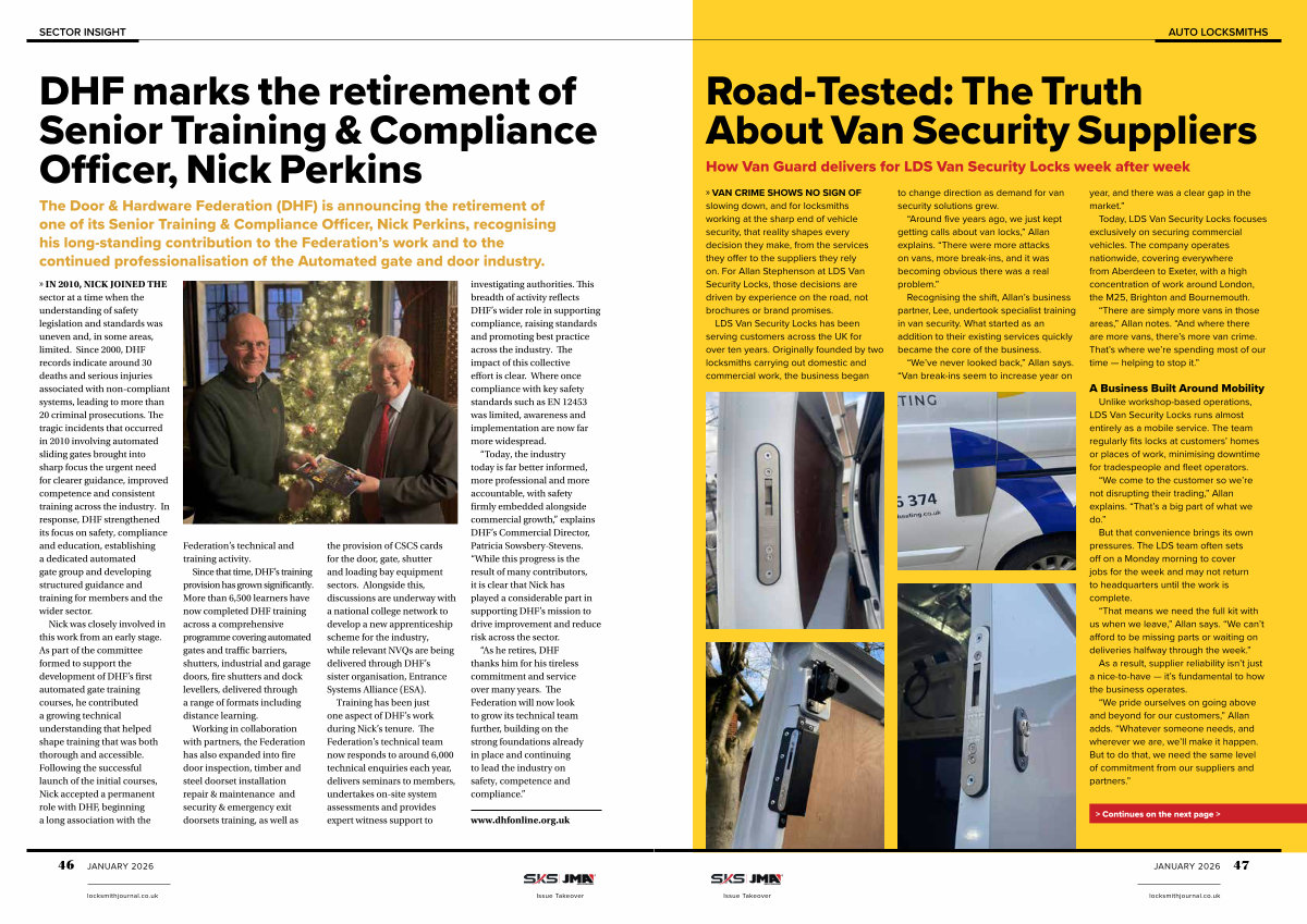 » IN 2010, NICK JOINED THE sector at a time when the understanding of safety legislation and standards was uneven and, in some areas, limited. Since 2000, DHF records indicate around 30 deaths and serious injuries associated with non-compliant systems, leading to more than 20 criminal prosecutions. The tragic incidents that occurred in 2010 involving automated sliding gates brought into sharp focus the urgent need for clearer guidance, improved competence and consistent training across the industry. In response, DHF strengthened its focus on safety, compliance and education, establishing a dedicated automated gate group and developing structured guidance and training for members and the wider sector.