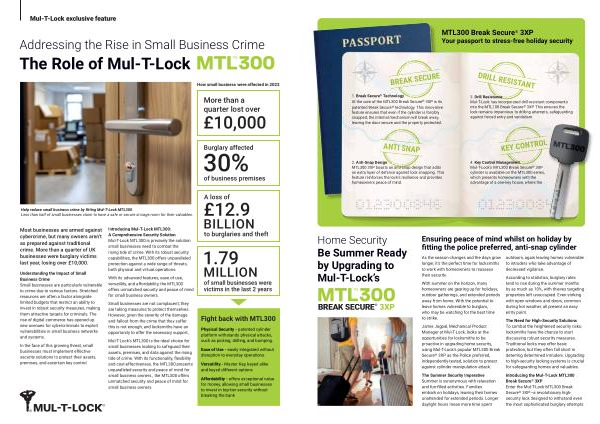 Mul-T-Lock ’ s MTL300 is the ideal choice for small businesses looking to safeguard their assets , premises , and data against the rising tide of crime . With its functionality , flexibility and cost-effectiveness , the MTL300 presents unparalleled security and peace of mind for small business owners ., the MTL300 offers unmatched security and peace of mind for small business owners .
