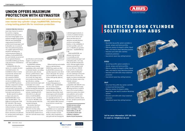 » PATENT PROTECTION IS A must-have feature for master key systems , stopping unauthorised replacement keys from being legally cut or made by unapproved partners . With the new keyMASTER range patented until 2036 , architectural ironmongers and locksmiths can rest assured that only authorised partners can supply replacement keys , and these will always be cut from genuine blanks . In addition , both keyMASTER ’ s key and cylinder are protected by two patented features , essentially doubling up the key copy protection credentials of the platform . keyMASTER offers the option of a complete factorycontrolled system . For installations where security is paramount , all keys and replacement cylinders are created by UNION . Alternatively , a locksmith section is available where approved UNION partners can buy components and key blanks for local key cutting and assembly requirements , providing total flexibility for all customers and end users .