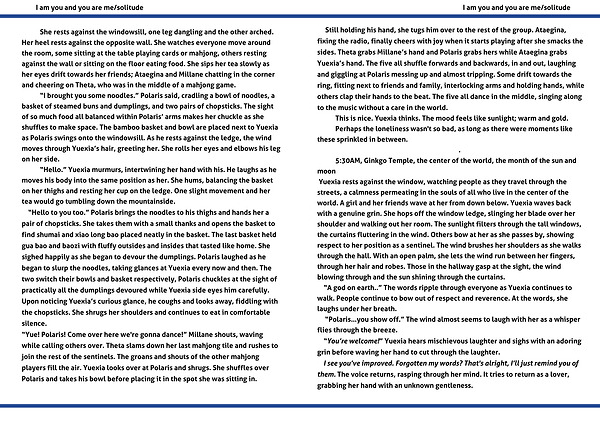 Yuexia rests against the window, watching people as they travel through the streets, a calmness permeating in the souls of all who live in the center of the world. A girl and her friends wave at her from down below. Yuexia waves back with a genuine grin. She hops off the window ledge, slinging her blade over her shoulder and walking out her room. The sunlight filters through the tall windows, the curtains fluttering in the wind. Others bow at her as she passes by, showing respect to her position as a sentinel. The wind brushes her shoulders as she walks through the hall. With an open palm, she lets the wind run between her fingers, through her hair and robes. Those in the hallway gasp at the sight, the wind blowing through and the sun shining through the curtains.