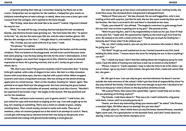 “Oh, that’s your sister? My parents would be mad if I acted like that.” A dainty little girl replied, with a side of disgust in her voice. Her hair is a silky cinnamon brown with ocean blue eyes, she has a top hat with a pearl white ribbon wrapped around it and wears a long black overcoat. She was sitting on the bench drinking apple juice in a small teacup. “She’s at the meadow, hunting for ‘aliens’ again.”She pointed at an open field near the playground, the frost covering the grass looked nice, there were trees and bushes all around, making it look like a forest. “Wouldn’t be surprised if she breaks a leg.” she laughs at the remark. The boy panicked and ran for the meadows.