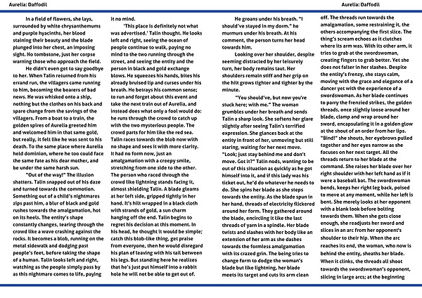 “You should’ve, but now you're stuck here; with me.” The woman grumbles under her breath and sends Talin a sharp look. She softens her glare slightly after seeing Talin’s terrified expression. She glances back at the entity in front of her, unmoving but still staring, waiting for her next move. “Look; just stay behind me and don’t move. Got it?” Talin nods, wanting to be out of this situation as quickly as he got himself into it, and if this lady was his ticket out, he’d do whatever he needs to do. She spins her blade as she steps towards the entity. As the blade spun in her hand, threads of electricity flickered around her form. They gathered around the blade, encircling it like the last threads of yarn in a spindle. Her blade twists and slashes with her body like an extension of her arm as she dashes towards the formless amalgamation with its crazed grin. The being tries to change form to dodge the woman’s blade but like lightning, her blade meets its target and cuts its arm clean off. The threads run towards the amalgamation, some restraining it, the others accompanying the first slice. The thing’s scream echoes as it clutches where its arm was. With its other arm, it tries to grab at the swordswoman, creating fingers to grab better. Yet she does not falter in her slashes. Despite the entity’s frenzy, she stays calm, moving with the grace and elegance of a dancer yet with the experience of a swordswoman. As her blade continues to parry the frenzied strikes, the golden threads, once slightly loose around her blade, clamp and wrap around her sword, encapsulating it in a golden glow at the shout of an order from her lips. “Bind!” she shouts, her eyebrows pulled together and her eyes narrow as she focuses on her next target. All the threads return to her blade at the command. She raises her blade over her right shoulder with her left hand as if it were a baseball bat. The swordswoman bends, keeps her right leg back, poised to move at any moment, while her left is bent. She merely looks at her opponent with a blank look before bolting towards them. When she gets close enough, she readjusts her sword and slices in an arc from her opponent's shoulder to their hip. When the arc reaches its end, the woman, who now is behind the entity, sheaths her blade. When it clinks, the threads all shoot towards the swordswoman’s opponent, slicing in large arcs; at the beginning