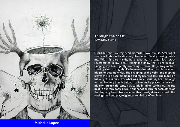I shall let him take my heart because I love him so. Stealing it from me. I relax as he slices my chest open. Finally looking inside me. With his bare hands, he breaks my rib cage. Each crack reverberates in my skull, letting me know that I am in love. Cupping my heart gently, watching it move. Its jerking motion slowing ever so slightly. Excitement danced across his face and his smile became wider. The snapping of the veins and muscles leaves me in a daze. He ripped out my heart so fast. The blood on his very skin is mine. For what was mine is his. My heart belongs to him. My very breath belongs to him. As he places my heart in his own broken rib cage, I place his in mine. Letting our hearts beat in our torn bodies, while our hands search for each other. As the dripping blood from one another slowly drives us mad. The rotting smell and playful glances remind us of our love.