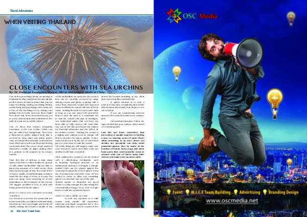 46 The MAG Vung Tau of the pedicellaria are present in the wound, they can be carefully removed by using shaving cream and gently scraping with a razor. Then, clean the wound with soap and water and flush the wound with lots of fresh water. Soaking the area in warm water bath as long as you can stand will sometimes help to ease the pain. It is important not to seal the wound with tape or bandages. Any embedded spines that you have not been able to fully remove will work their way out of the skin and lessen the chance for bacterial infections and the effect of the urchin’ s venom. Soaking the wound in a slightly acid solution such as vinegar will help to dissolve the spines quickly. In fact, many locals swear by the use of warm lime juice or even urine to soak the wound. TIP: When doing any self-surgery, make sure your tweezers, razors and other tools are sterilized with heat or alcohol.