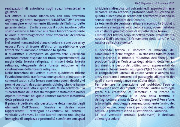 Nelle intenzioni dell'artista questo quadrittico riflette l'evoluzione della trasformazione spaziale di meteoriti e cometari caduti sulla Terra e considera questi detriti vivi perché costituiti da sostanze microbiologiche che hanno dato origine alla vita e quindi alla fauna selvatica. La “Celebrazione della foresta reliquia” è stata espressa nel dipinto “Primule” nel quale l'autrice racconta la fioritura delle primule rosse.