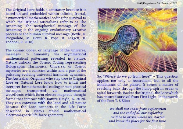 So: “Where do we go from here?” – This question applies not only to Australians, but to all the inhabitants of the planet. It seems a matter of reaching back through the holograph in order to spiral forwards: Back to the Original, the Lore which has ensured survival from First Light. In the words of the Poet T. S Eliot: