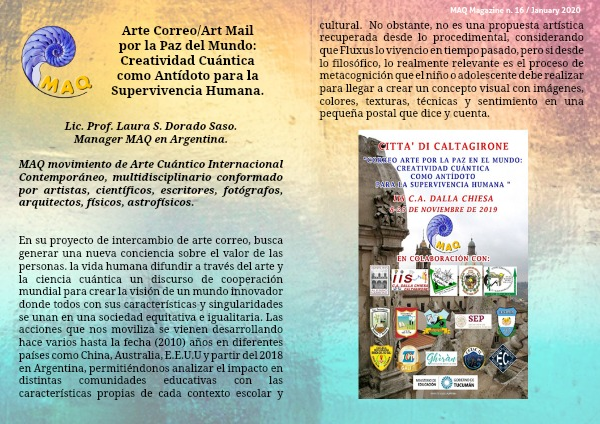 En su proyecto de intercambio de arte correo, busca generar una nueva conciencia sobre el valor de las personas. la vida humana difundir a través del arte y la ciencia cuántica un discurso de cooperación mundial para crear la visión de un mundo innovador donde todos con sus características y singularidades se unan en una sociedad equitativa e igualitaria. Las acciones que nos moviliza se vienen desarrollando hace varios hasta la fecha (2010) años en diferentes países como China, Australia, E.E.U.U y partir del 2018 en Argentina, permitiéndonos analizar el impacto en distintas comunidades educativas con las características propias de cada contexto escolar y cultural. No obstante, no es una propuesta artística recuperada desde lo procedimental, considerando que Fluxus lo vivencio en tiempo pasado, pero si desde lo filosófico, lo realmente relevante es el proceso de metacognición que el niño o adolescente debe realizar para llegar a crear un concepto visual con imágenes, colores, texturas, técnicas y sentimiento en una pequeña postal que dice y cuenta.