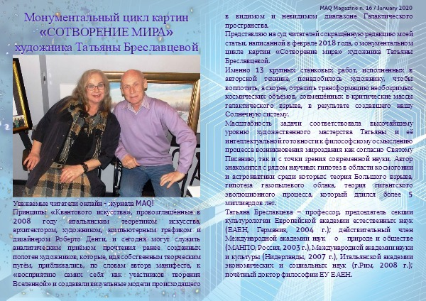 Представляю на суд читателей сокращённую редакцию моей статьи, написанной в феврале 2018 года, о монументальном цикле картин «Сотворение мира» художника Татьяны Бреславцевой.