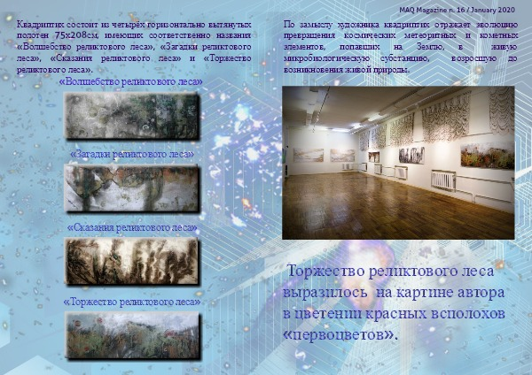 Квадриптих состоит из четырёх горизонтально вытянутых полотен 75х208см, имеющих соответственно названия «Волшебство реликтового леса», «Загадки реликтового леса», «Сказания реликтового леса» и «Торжество реликтового леса».
