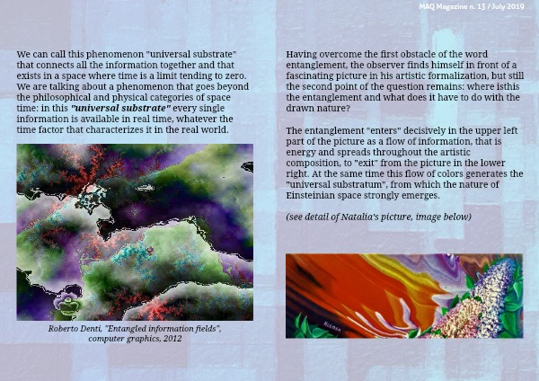 The entanglement "enters" decisively in the upper left part of the picture as a flow of information, that is energy and spreads throughout the artistic composition, to "exit" from the picture in the lower right. At the same time this flow of colors generates the "universal substratum", from which the nature of Einsteinian space strongly emerges.