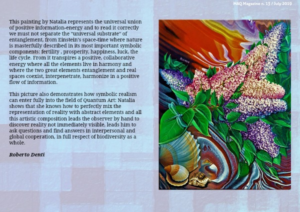 This painting by Natalia represents the universal union of positive information-energy and to read it correctly we must not separate the "universal substrate" of entanglement, from Einstein's space-time where nature is masterfully described in its most important symbolic components: fertility , prosperity, happiness, luck, the life cycle. From it transpires a positive, collaborative energy where all the elements live in harmony and where the two great elements entanglement and real spaces coexist, interpenetrate, harmonize in a positive flow of information.