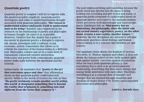 However, I believe that this duality has a point of encounter in quantum poetry, a dialogue to express, tell, dream, investigate with a cultural, social, economic, artistic connotation that allows us to rethink the existence of the human being in a different way. Philosophy, science and art in a same level of humanized, connected creative interaction. Philosophy and poetry both communicate, quantum poetry seeks unity between the emotional and the rational.