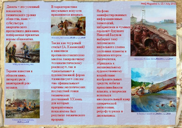 На фоне манифестированных информационных технологий, кибернетики и «умных городов» будущего Николай Базунов выбирает тему летописного визуального слепка состояния планеты в ушедшем втором тысячелетии, обращаясь к эмоциональному художественному воздействию изобразительных средств, избегая прямолинейности плаката, а творчески используя иносказательный жанр сатирической антиутопии, ретрофутуризма и дизельпанка.