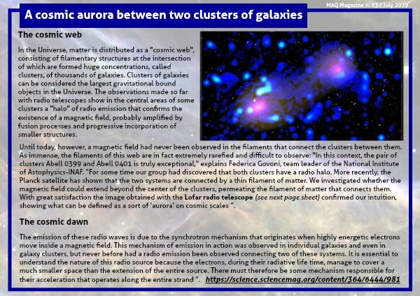 Until today, however, a magnetic field had never been observed in the filaments that connect the clusters between them. As immense, the filaments of this web are in fact extremely rarefied and difficult to observe: "In this context, the pair of clusters Abell 0399 and Abell 0401 is truly exceptional," explains Federica Govoni, team leader of the National Institute of Astophysics-INAF. “For some time our group had discovered that both clusters have a radio halo. More recently, the Planck satellite has shown that the two systems are connected by a thin filament of matter. We investigated whether the magnetic field could extend beyond the center of the clusters, permeating the filament of matter that connects them. With great satisfaction the image obtained with the Lofar radio telescope (see next page sheet) confirmed our intuition, showing what can be defined as a sort of ‘aurora’ on cosmic scales ”.