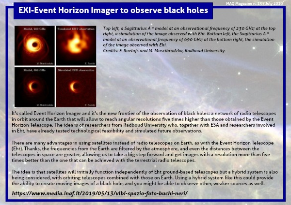 It's called Event Horizon Imager and it's the new frontier of the observation of black holes: a network of radio telescopes in orbit around the Earth that will allow to reach angular resolutions five times higher than those obtained by the Event Horizon Telescope. The idea is of researchers from Radboud University who, together with ESA and researchers involved in Eht, have already tested technological feasibility and simulated future observations.