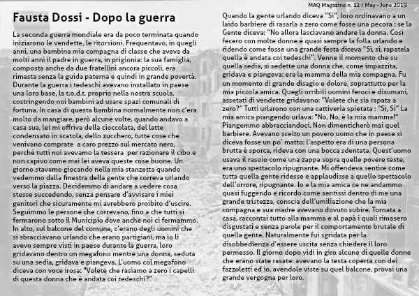 Quando la gente urlando diceva ”Si”, loro ordinavano a un laido barbiere di rasarla a zero come fosse una pecora : se la Gente diceva: ”No allora lasciavano andare la donna. Così fecero con molte donne è quasi sempre la folla urlando e ridendo come fosse una grande festa diceva “Sì, si, rapatela quella è andata coi tedeschi”. Venne il momento che su quella sedia, si sedette una donna che, come impazzita, gridava e piangeva: era la mamma della mia compagna. Fu un momento di grande disagio e dolore, soprattutto per la mia piccola amica. Quegli orribili uomini feroci e disumani, assetati di vendette gridavano: ”Volete che sia rapata a zero?” Tutti urlarono con una cattiveria spietata : “Si, Si” La mia amica piangendo urlava: "No, No, è la mia mamma!" Piangemmo abbracciandoci. Non dimenticherò mai quel barbiere. Avevano scelto un povero uomo che in paese si diceva fosse un po’ matto: l’aspetto era di una persona brutta è sporca, rideva con una bocca sdentata. Quest’uomo usava il rasoio come una zappa sopra quelle povere teste, era uno spettacolo ripugnante. Mi offendeva sentire come tutta quella gente ridesse e applaudisse a quello spettacolo dell’orrore, ripugnante. Io e la mia amica ce ne andammo quasi fuggendo e ricordo come sentissi dentro di me una grande tristezza, conscia dell’umiliazione che la mia compagna e sua madre avevano dovuto subire. Tornata a casa, raccontai tutto alla mamma e al papà i quali rimasero disgustati e senza parole per il comportamento brutale di quella gente. Naturalmente fui sgridata per la disobbedienza d’essere uscita senza chiedere il loro permesso. Il giorno dopo vidi in giro alcune di quelle donne che erano state rasate: avevano la testa coperta con dei fazzoletti ed io, avendole viste su quel balcone, provai una grande vergogna per loro.