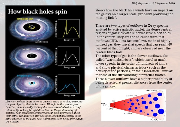Like most objects in the universe (planets, stars, asteroids, and other compact objects), black holes rotate. We refer to this property as “spin” or, more formally, its “angular momentum” about its axis of rotation. By looking for light distortions in X-rays streaming off material near black holes, researchers can gain information about their spins. The accretion disk also spins, and not necessarily in the same direction as the black hole. Astronomy: Roen Kelly, after NASA/JPL-Caltech