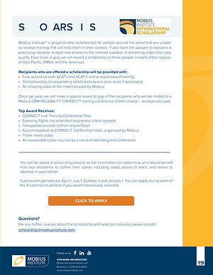 Mobius Institute™ is proud to offer scholarships for people around the world that are unable to receive training that will help them in their careers . If you have the passion to become a practicing vibration analyst and access to the internet capable of streaming video then you qualify . Four times a year , we will award a scholarship to three people in each of the regions of Asia-Pacific , EMEA , and the Americas .