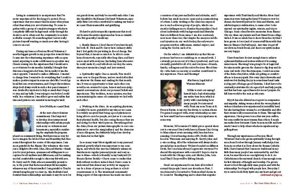 Through my experience as a Precious Blood Volunteer I have also grown spiritually. Going through rcia from October through January really helped me focus in on what it is I love about the Roman Catholic faith. I have learned that I am more traditional in my faith than many people I am surrounded by, and that is ok, because there is no one right way to do it. As Catholicism is the universal church, it has enough room for licit diversity of thought and worship. I’ ve grown closer to God through daily mass, prayer, and with the relationships I’ ve forged with people here. Every day I try to invite God’ s Holy Spirit into my heart and get out continued on page 14