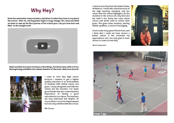 I came to Ironi Hey from the United States of America. I chose this school because of the high learning standards and the values that the school highlights. All the students in the school are very kind and the staff is too. Every one cares about school and works hard to achive their goals. This gives other students, sharing similar qualities, a sense of belonging.