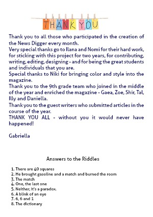 Thank you to the 9th grade team who joined in the middle of the year and enriched the magazine - Gaea, Zoe, Shir, Tal, Illy and Daniella.