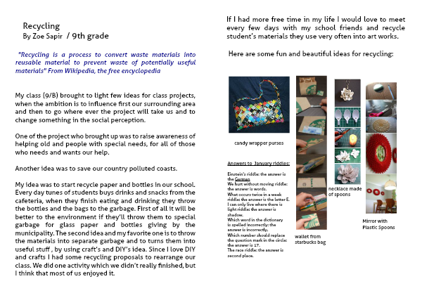 Every day tunes of students buys drinks and snacks from the cafeteria, when they finish eating and drinking they throw the bottles and the bags to the garbage. First of all it will be better to the environment if they’ll throw them to special garbage for glass paper and bottles giving by the municipality. The second idea and my favorite one is to throw the materials into separate garbage and to turns them into useful stuff , by using craft’s and DIY’s idea. Since I love DIY and crafts I had some recycling proposals to rearrange our class. We did one activity which we didn’t really finished, but I think that most of us enjoyed it.
